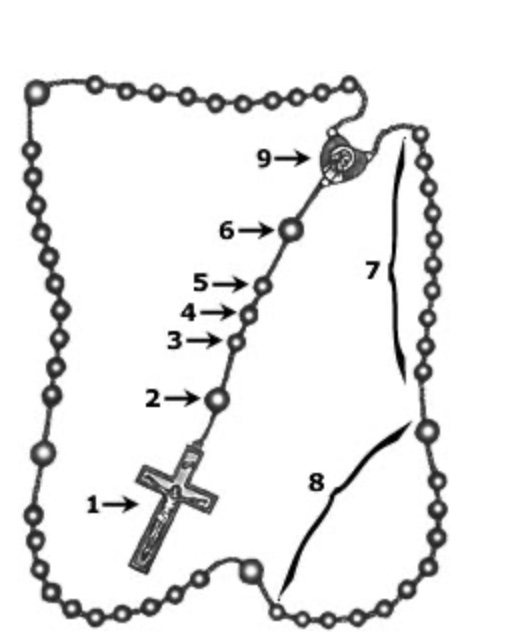 Saying the “Eternal Father” (6) on the “Our Father” bead and then 10 “For the sake of His sorrowful Passion” (7) on the following “Hail Mary” beads.